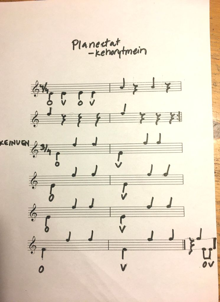 Erityisopettajaopintojen harjoittelussa olin pienryhmäeskarissa suorittamassa harjoittelua. Tammikuun teemana oli perinteisesti avaruus, jonka innoittamana otin planeetat mukaan musiikkituokioon. Planeettojen nimet muodostavatkin luonnostaan erilaisia nuottien aika-arvoja. Pluto ei enää nykyisin kuulu planeettojen joukkoon, mutta halusin kuitenkin säilyttää sen tässä rytmiharjoituksessa.