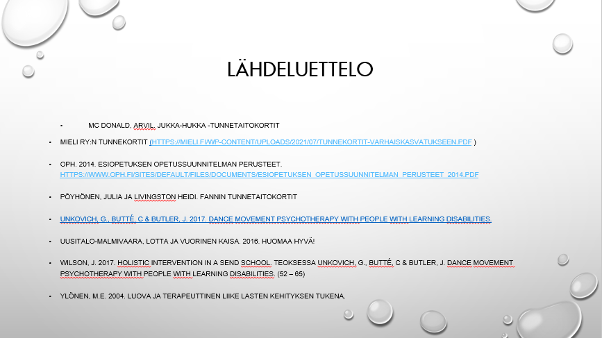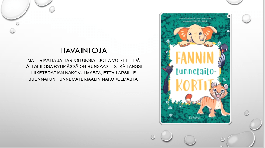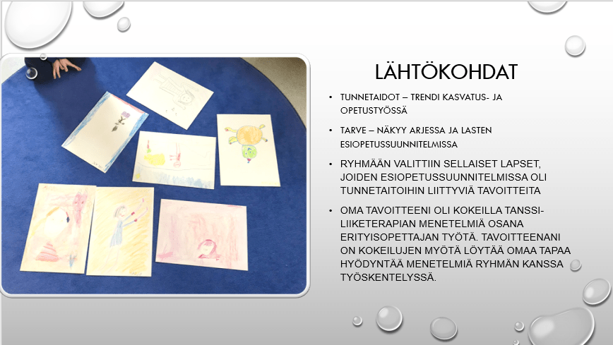 Opiskelin 2021 – 22 Tanssi- ja liiketerapian perusopinnot Jyväskylässä Eino Roiha -instituutissa. Opintojen loppupuolella sai tehdä kehittämistehtävän haluamastaan näkökulmasta. Aihevalintaani vaikutti se, että työskentelin viime lukuvuonna varhaiskasvatuksen erityisopettajana päiväkodissa, jossa vastuullani oli pääasiassa esikoululaisia. Valitsinkin kehittämistehtäväni kohderyhmäksi eskarilaiset. Otsikoksi muodostui ”Tunneryhmät esikoululaisille tanssi- ja liiketerapian keinoin”.